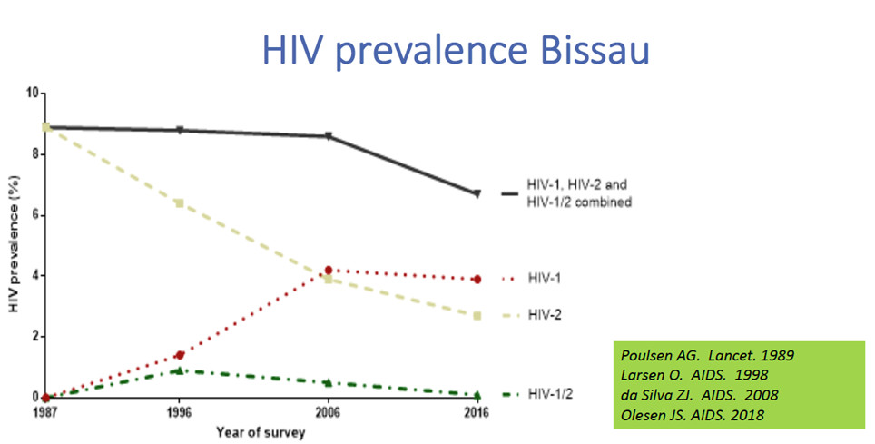 - Olesen JS, Jespersen S, da Silva ZJ, Rodrigues A, Erikstrup C, Aaby P, Wejse C, Hønge BL. HIV-2 continues to decrease, whereas HIV-1 is stabilizing in Guinea-Bissau. AIDS. 2018 Jun 1;32(9):1193-1198.